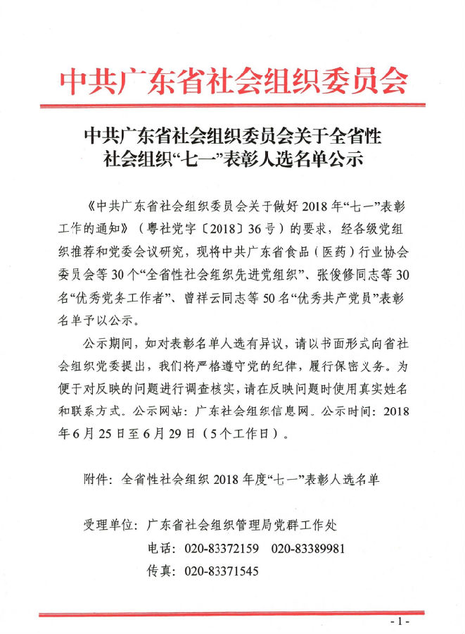 中共广东省社会组织委员会关于全省性社会组织“七一”表彰人选名单公示