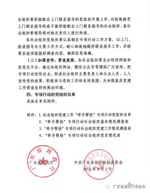 据悉,“牵手帮扶”专项行动是广东省民政厅加强党对基层工作的全面领导的客观需要,是为贯彻落实《中共广东省委办公厅关于印发<广东省加强党的基层组织建设三年行动计划(2018-2020 年)>的通知》(粤办发〔2018〕19号)要求的一项基础性工作任务,是完成中组部、省委组织部关于提升社会组织领域党的组织和党的工作覆盖质量要求的具体举措。各社会组织、社会组织党组织要把专项行动作为一项重要任务抓好落实。