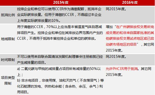 而在2015-2016年度,并未对可用于抵消的CCER 和PHCER 总量进行控制,仅是在抵消比例 鼎盛平台,CCER项目地域,CCER产生时间和CCER项目类型做了规定(见表3),可以看出,从2016年度开始,广东碳市场对抵消机制的规定就有从紧的趋势,可用于抵消的CCER项目必须不是其他7个试点省市和已启动碳市场的项目,且CCER项目必须在广州碳排放权交易所完成交易。