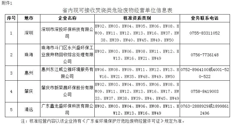 附件:1.省内现可接收焚烧类危险废物经营单位信息表
