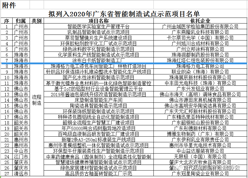 8月6日,广东省工信厅官网发布《广东省工业和信息化厅关于2020年广东省智能制造试点示范项目名单的公示》,对初步确定的2020年广东省智能制造试点示范项目名单进行公示。其中流程制造类别中,珠海红塔仁恒包装股份有限公司的“涂布白卡纸智能制造工厂”项目被列入公示名单。公示原文如下: 转发