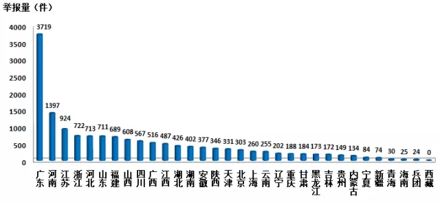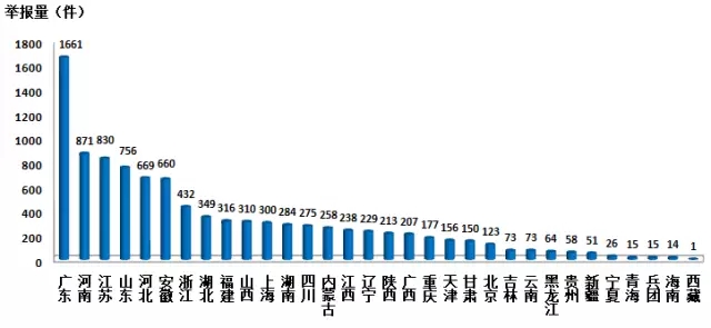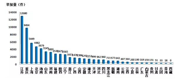 排名 | 省份 | 举报量/件 | 排名 | 省份 | 举报量/件 | |