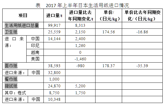根据日本生活用纸工业会的统计,2017年上半年日本生活用纸的进口量呈现增长趋势,其中自中国进口的生活用纸占总量的一半以上 鼎盛平台,具体数据如下表所示。
