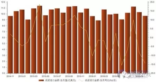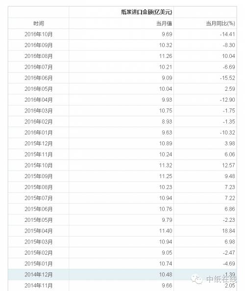 2016年10月我国纸浆进口金额当月值9,69亿美元,当月同比下降14 鼎盛平台,41%。。