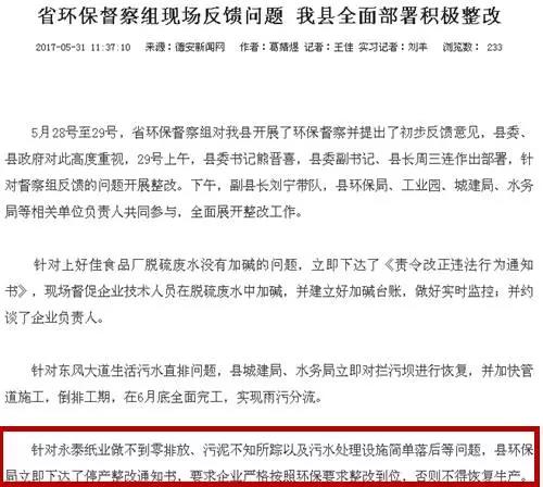 调查核实情况:据德安新闻网报道,5月28号至29号,江西省环保督察组对德安县开展了环保督察并提出了初步反馈意见,县委、县政府对此高度重视。29号下午,副县长刘宁带队,县环保局、工业园、城建局、水务局等相关单位负责人共同参与,全面展开整改工作。