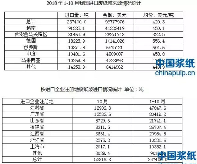 今年以来,我国废纸进口量持续下滑,为弥补进口废纸缺口,废纸浆进口量大幅增加。据统计,2018年10月份我国进口废纸浆5,38万吨,均价434,1美元/吨;1-10月累计进口23,7万吨,均价420,3美元/吨。 鼎盛平台。