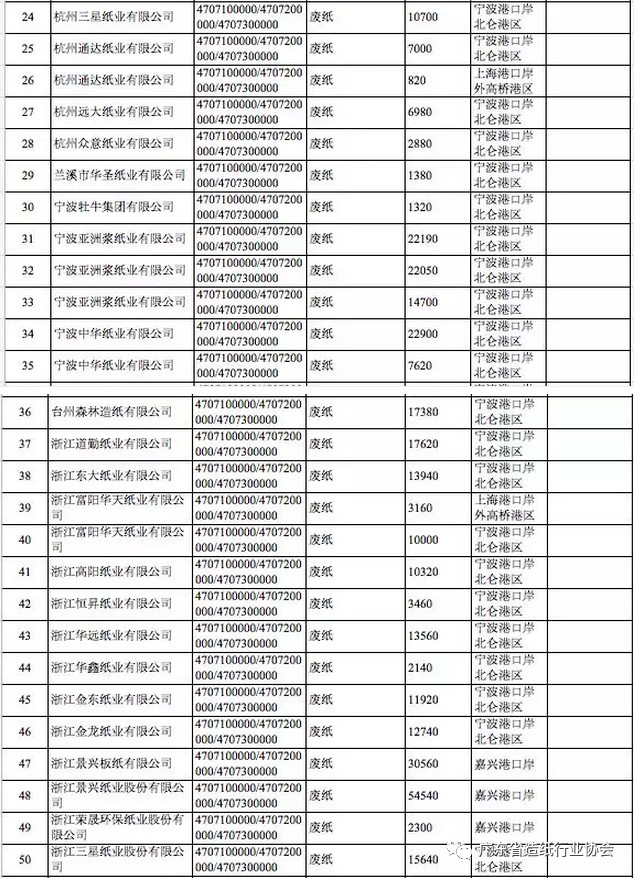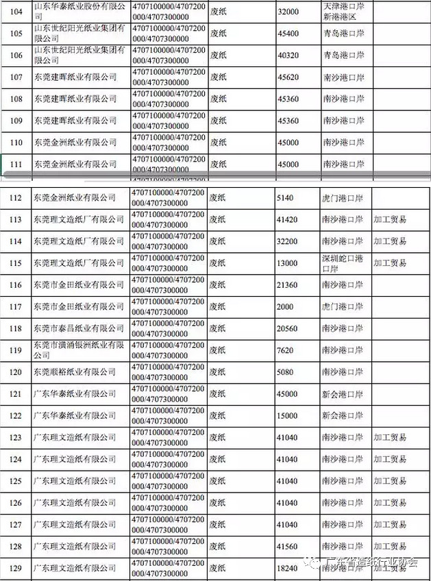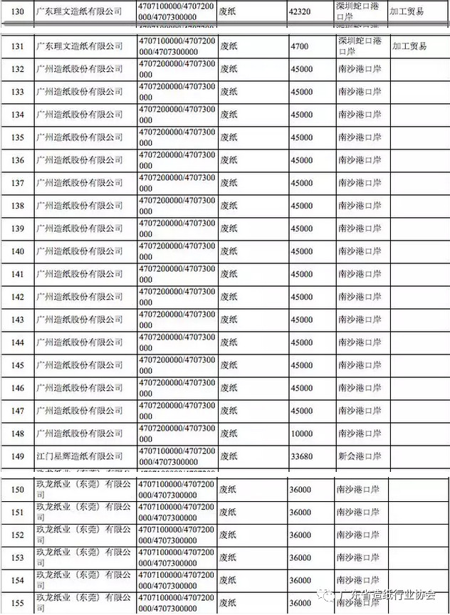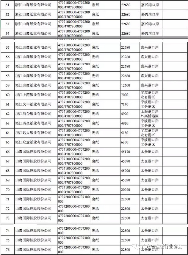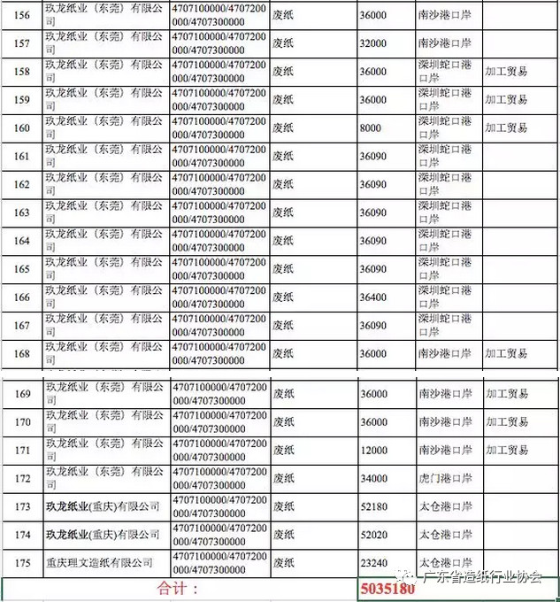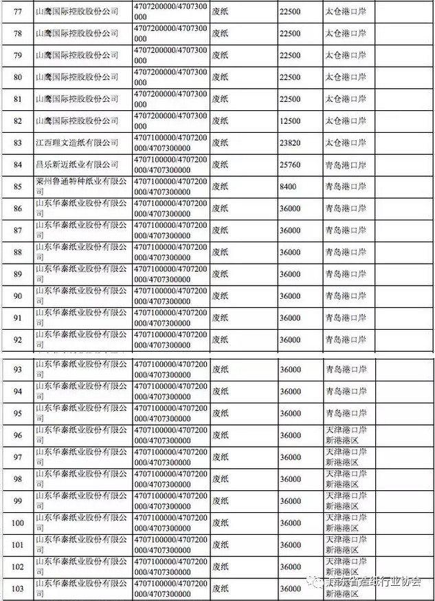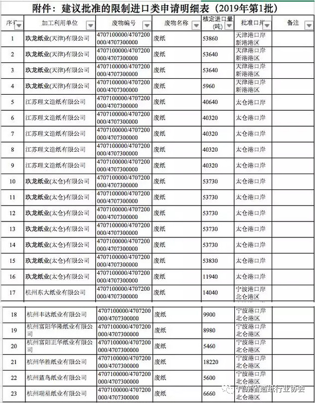 12月14日,固废中心公布的2019年第1批建议批准的限制进口类申请明细表显示,共通过:玖龙纸业(天津)有限公司,江苏理文造纸有限公司,玖龙纸业(太仓)有限公司,杭州东大纸业有限公司,杭州丰达纸业有限公司,杭州富阳华隆纸业有限公司,杭州富阳正华纸业有限公司,杭州华胜纸业有限公司,杭州蓝鸟纸业有限公司,杭州瑞星纸业有限公司,杭州三星纸业有限公司,杭州通达纸业有限公司,杭州远大纸业有限公司,杭州众意纸业有限公司,兰溪市华圣纸业有限公司,宁波牡牛集团有限公司,宁波亚洲浆纸业有限公司,宁波中华纸业有限公司,台州森林造纸有限公司,浙江道勤纸业有限公司,浙江东大纸业有限公司,浙江富阳华天纸业有限公司,浙江高阳纸业有限公司,浙江恒昇纸业有限公司,浙江华远纸业有限公司,浙江华鑫纸业有限公司,浙江金东纸业有限公司,浙江金龙纸业有限公司,浙江景兴板纸有限公司,浙江景兴纸业股份有限公司,浙江荣晟环保纸业股份有限公司,浙江三星纸业股份有限公司,浙江山鹰纸业有限公司,浙江上游纸业有限公司,浙江文丰纸业有限公司,浙江涌金纸业有限公司,浙江远大纸业有限公司,浙江众意纸业有限公司,山鹰国际控股股份公司,江西理文造纸有限公司,昌乐新迈纸业有限公司,莱州鲁通特种纸业有限公司,山东华泰纸业股份有限公司,山东世纪阳光纸业集团有限公司,东莞建晖纸业有限公司,东莞金洲纸业有限公司,东莞理文造纸厂有限公司,东莞市金田纸业有限公司,东莞市泰昌纸业有限公司,东莞市潢涌银洲纸业有限公司,东莞顺裕纸业有限公司,广东华泰纸业有限公司,广东理文造纸有限公司,广州造纸股份有限公司,江门星辉造纸有限公司,玖龙纸业(东莞)有限公司,玖龙纸业(重庆)有限公司,重庆理文造纸有限公司。废纸核定进口总量为503,5180万吨。 鼎盛平台。