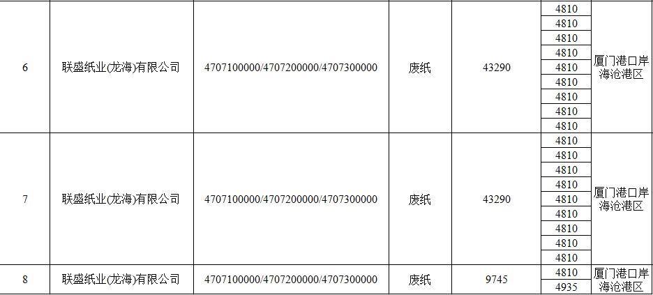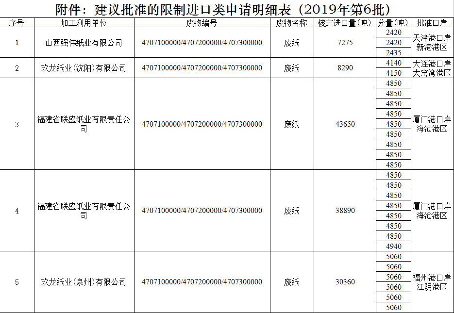 2019年4月23日,固废中心公布的2019年第6批限制进口类申请明细表显示,共通过废纸核定进口总量为22,479万吨。本次共计5家企业获批,分别是山西强伟纸业有限公司、玖龙纸业(沈阳)有限公司、福建省联盛纸业有限责任公司、玖龙纸业(泉州)有限公司、联盛纸业(龙海)有限公司。 鼎盛平台。