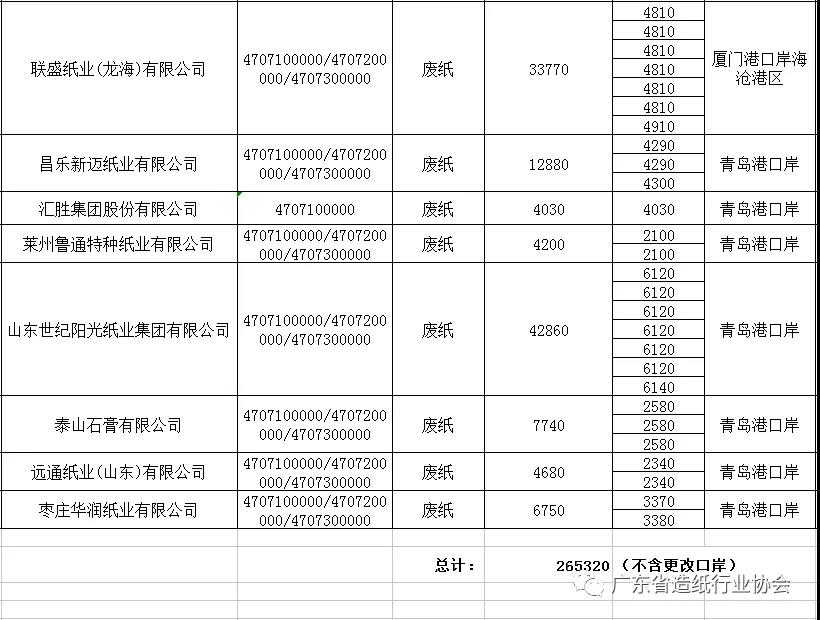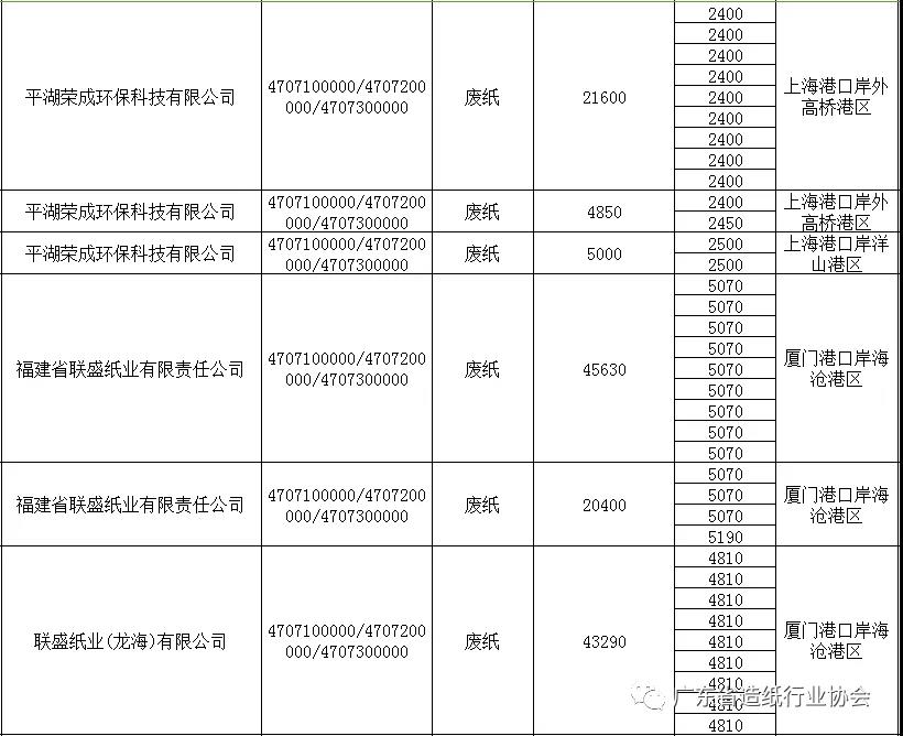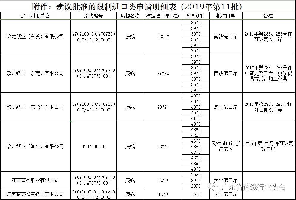 2019年8月14日,中国固废中心公布的2019年第11批限制进口类申请明细表显示,共通过废纸核定进口总量为26,532万吨(不含更改口岸)。玖龙纸业(东莞)有限公司、玖龙纸业(河北)有限公司共计11,574万吨为更改口岸。本批次没有广东企业获批进口废纸。 鼎盛平台。