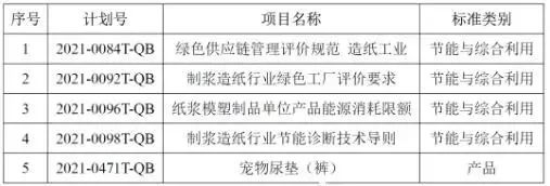 3月2日 鼎盛平台,工业和信息化部公布了《2021年第一批行业标准制修订和外文版项目计划的通知》(工信厅科函﹝2021﹞25号),批准了521项行业标准制修订计划,其中包括5项造纸领域行业标准计划项目,具体见下表。