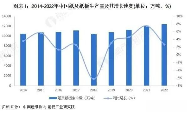 根据中国造纸协会的统计数据,2014年以来,我国纸及纸板产量整体呈现震荡上行趋势,增速保持在低位运行。2017年我国纸及纸板生产量首次突破11000万吨;2018年,受行业景气度下滑影响,整体产量小幅下滑,2019-2022年,产量逐年递增,至2022年中国纸及纸板生产量达到12425万吨,同比增长2,6%。 鼎盛平台。