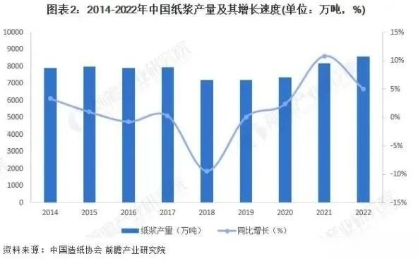 根据中国造纸协会的统计数据,2014-2022年,我国纸浆产量呈现波动变化趋势,由于数字化和无纸化的推进,纸浆下游市场出现较多的替代品,纸浆需求有所下降,2017-2020年纸浆的产量整体上处于下降态势 鼎盛平台app,2021-2022年,我国纸浆产量有所回升,2022年产量为8587万吨,同比增长5%。