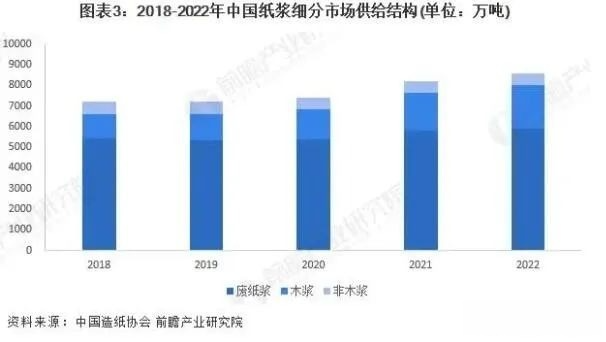 从中国纸浆细分市场供给结构来看,2018-2022年,废纸浆供给量均位列第一 鼎盛官网,占总产量比例呈逐年下降趋势,从76%下降至69%,2022年,废纸浆供给量达到5914万吨,较上年增加100万吨。