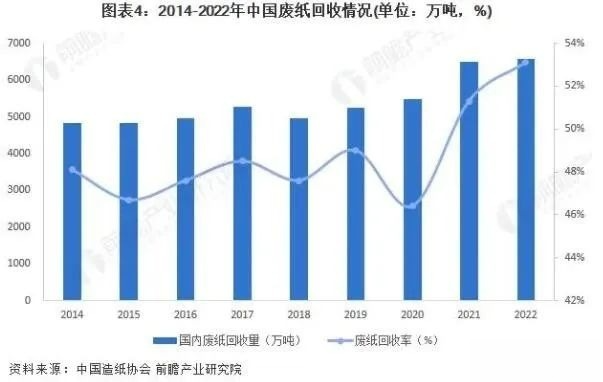 2014-2022年 ,中国废纸回收量及回收率均呈波动上升趋势。2014年,中国废纸回收量为4841万吨,回收率为48 鼎盛登录,1%;到2022年,我国废纸回收量达到6600万吨左右,回收率增至53%以上。。