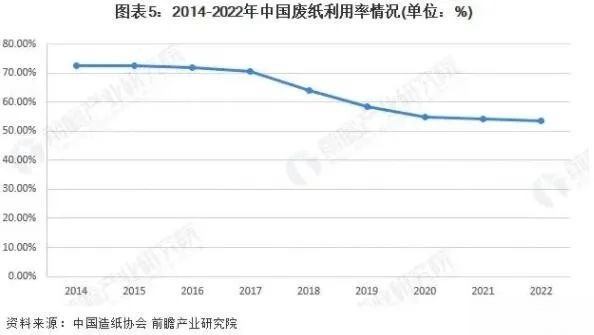 近年来,我国废纸回收量不断增长,相比较而言,废纸消费量小于回收量,这导致我国废纸利用率下滑明显。2014-2017年,我国废纸利用率均高于70%,到2022年,我国废纸利用率已跌至53,5%。 鼎盛手机版。