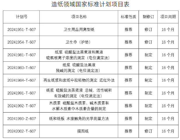 近日,国家标准化管理委员会下达2024年第四批推荐性国家标准计划及相关标准外文版计划的通知(国标委发[2024] 28号),其中,《卫生巾(护垫)》等9项造纸领域国家标准计划项目获批立项,具体如下所示 鼎盛平台。 来源:生活用纸杂志