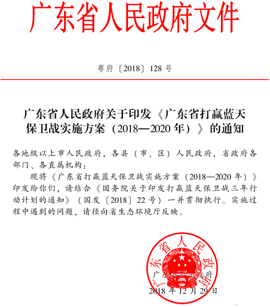 广东省人民政府关于印发《广东省打赢蓝天保卫战实施方案(2018—2020年)》的通知