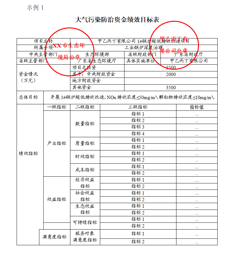 (2)项目绩效目标申报表。(需加盖项目承担单位和市生态环境局公章)(见示例1)