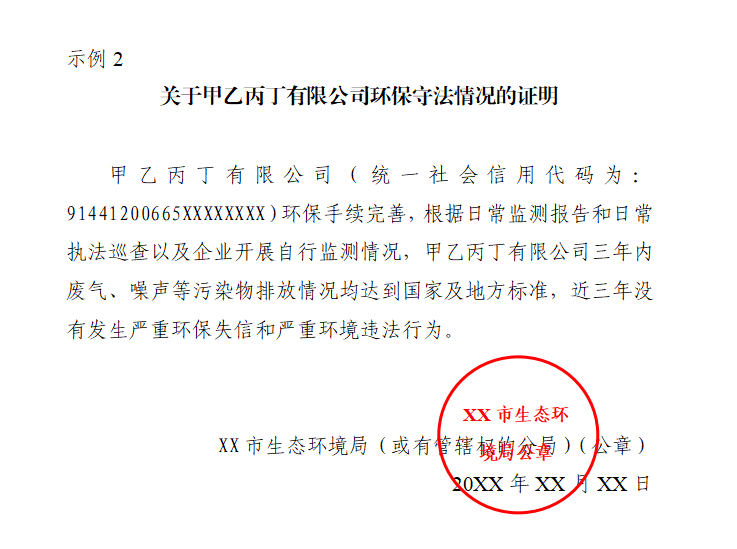 (3)提供当地生态环境主管部门出具的近三年不存在严重环保失信和严重环境违法行为的证明或说明(《中央生态环境资金项目储备库入库指南(2021年)》条款六:严格项目审核把关。省级生态环境、财政部门要根据职责分工对建设方案必要性、可行性、绩效目标、投资估算、资金筹措、中央资金申请等进行严格把关,确保项目真实必要。对于存在严重环保失信和严重环境违法行为的企业项目三年内不得申请入库。)(见示例2)。