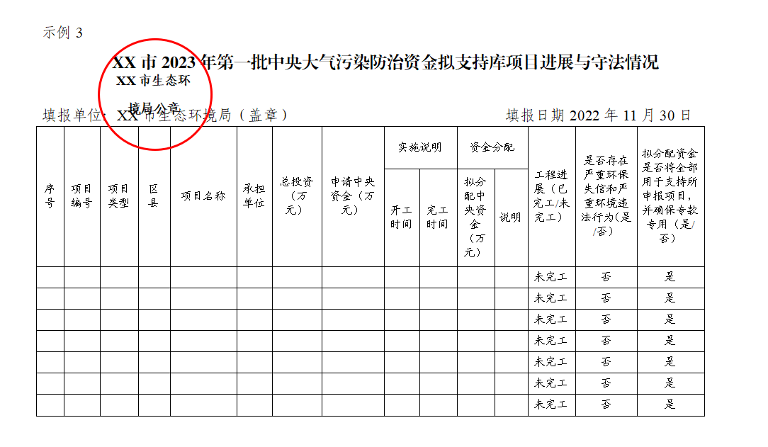中央资金下拨后,由省生态环境厅按照年度工作重点,在项目库中择优选择项目,征求地市意见,与生态环境部大气司沟通后形成拟支持清单。地市在资金分配下达前,应核对项目的进展情况、严重环保失信和严重环境违法情况,形成清单并加盖公章提交省生态环境厅(示例3)。省生态环境厅按流程完成资金分配和备案工作。