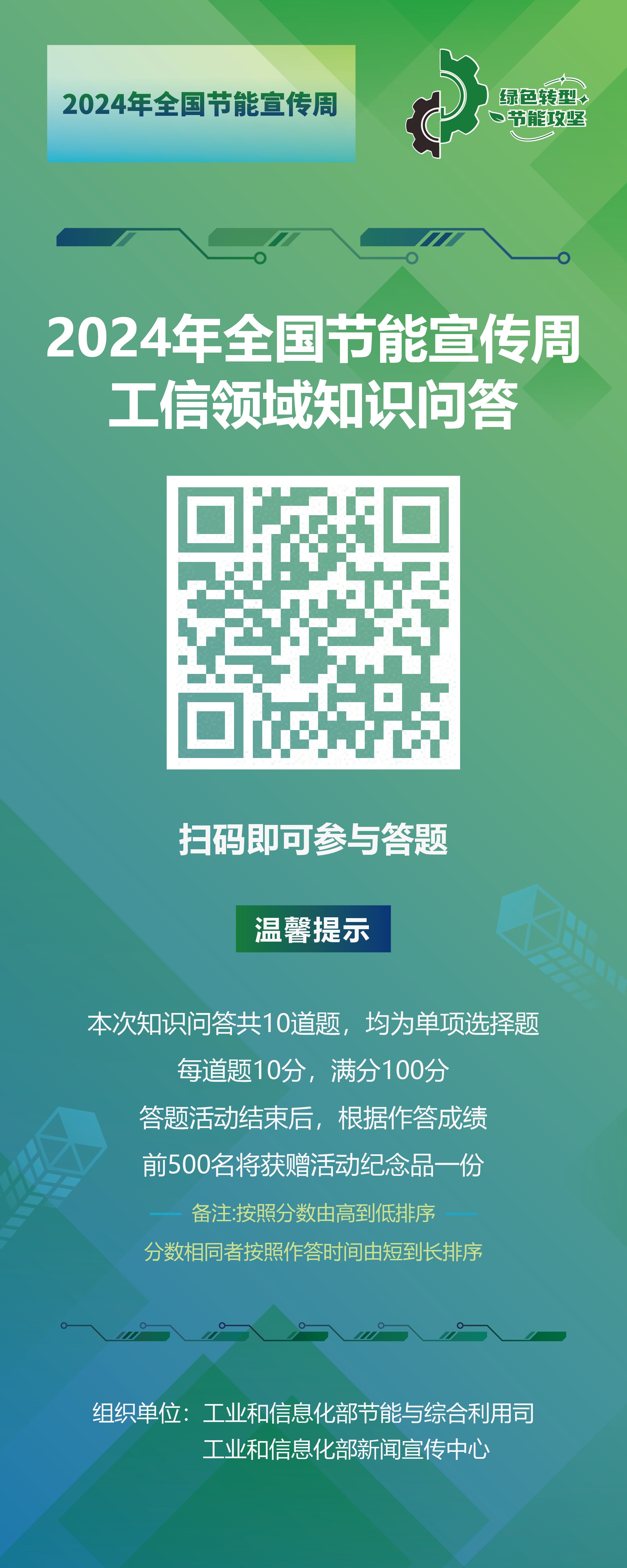 2024年全国节能宣传周为5月13日至19日 活动主题是“绿色转型,节能攻坚” 关于节能降碳 您了解多少呢? 为节能降碳贡献自己的一份力量 可扫码参与2024年全国节能宣传周 工信领域知识问答 有机会获得纪念礼品哦 来源:工信部