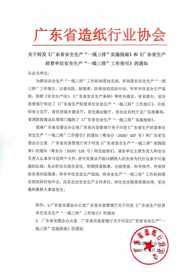 现将广东省安委会办公室广东省应急管理厅关于印发《广东省生产经营单位安全生产“一线三排”工作指引》的通知(粤安办〔2020〕107 号)和广东省安委会办公室 广东省应急管理厅关于印发《广东省安全生产“一线三排”实施指南》的通知(粤安办〔2020〕126 号)转发给你们,请各单位主要负责人和安全负责人认真学习这两个文件,坚守发展决不能以牺牲人的生命为代价这条不可逾越的红线,务必把安全放在首位,积极排查隐患,全面排查,科学排序,有效排除各类风险隐患,牢牢守住安全生产底线,将安全生产“一线三排”工作机制落实到实际行动中去,压实企业安全生产主体责任 鼎盛平台app,深化安全隐患排查治理,坚决遏制重特大事故发生, 。
