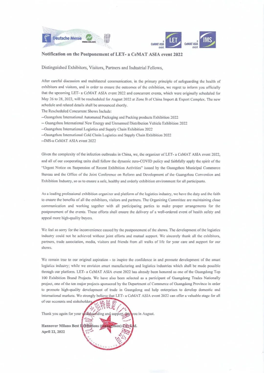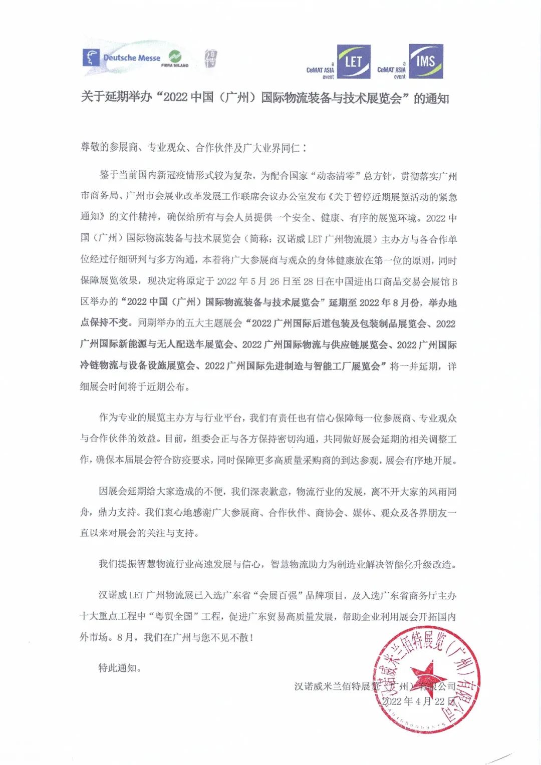 关于延期举办“2022中国(广州)国际物流装备与技术展览会”的通知