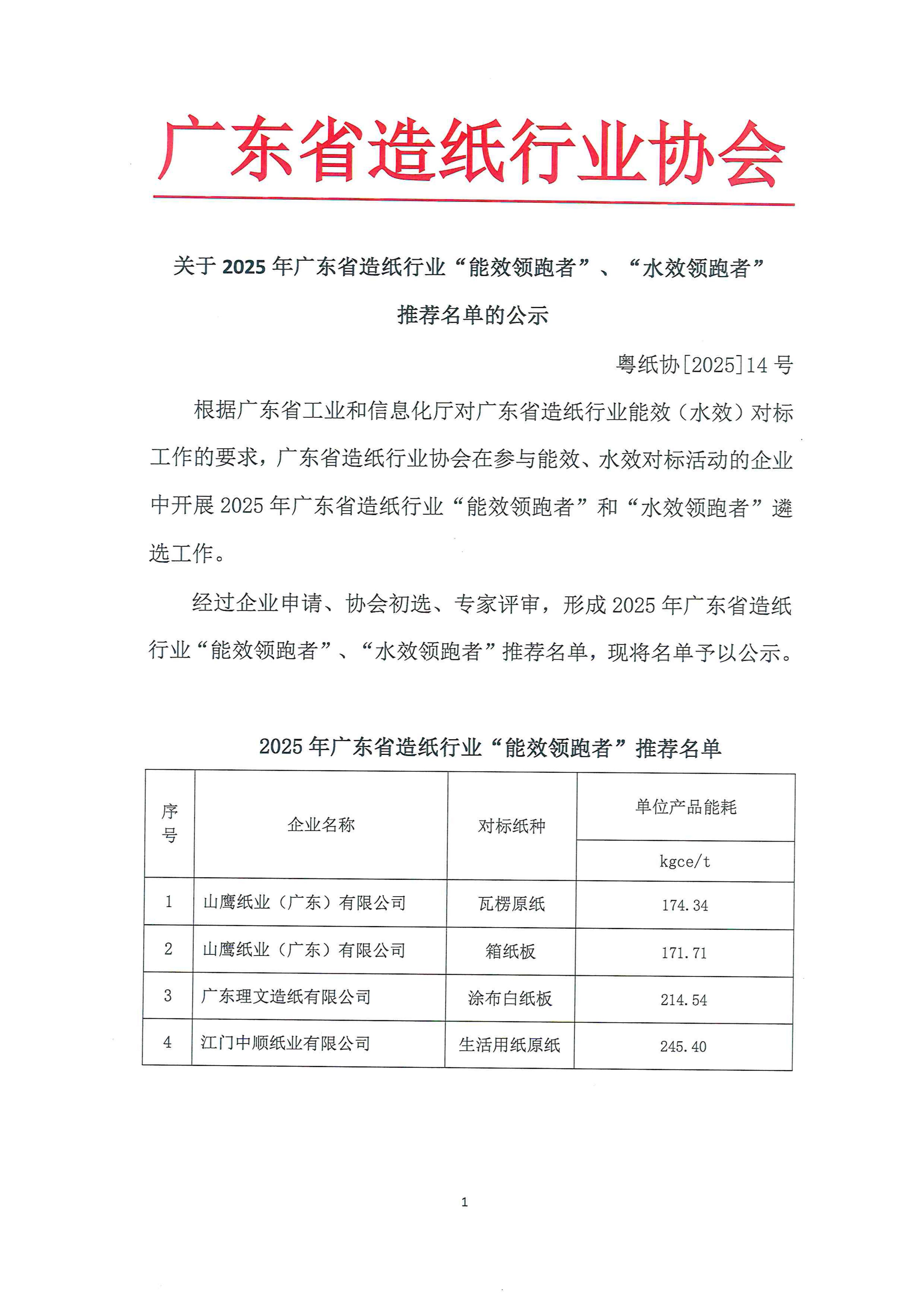关于2025年广东省造纸行业“能效领跑者”、“水效领跑者”推荐名单的公示