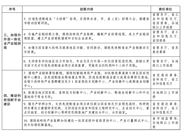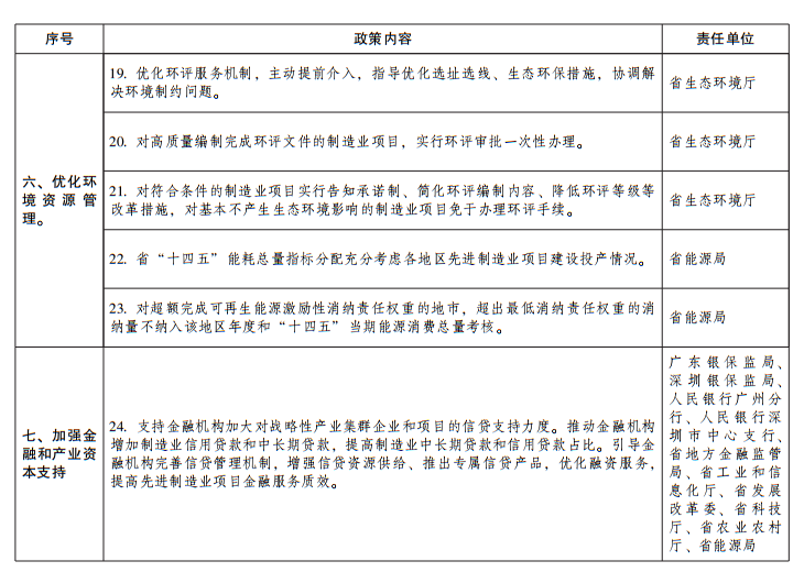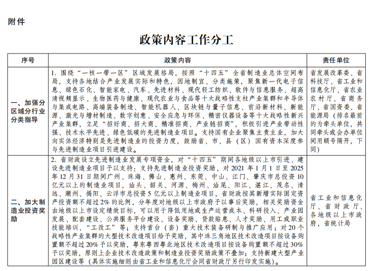 省财政设立先进制造业发展专项资金,对“十四五”期间各地级以上市引进 鼎盛网页版,建设先进制造业项目予以支持:支持先进制造业投资奖励,对2021年1月1日至2025年12月31日期间广州,珠海,佛山,惠州,东莞,中山,江门,肇庆市总投资10亿元以上的制造业项目,汕头,韶关,河源,梅州,汕尾,阳江,湛江,茂名,清远,潮州,揭阳,云浮市总投资5亿元以上制造业项目,省财政按其新增实际固定资产投资额不超过2%的比例,分年度对地级以上市政府予以事后奖励,相关奖励资金由地级以上市设定绩效目标,可以用于降低用地或生产运营成本,科研投入,产业园发展,配套建设,公共服务平台建设,设备奖励,贷款贴息,人才奖励,用工或职业技能培训,“工改工”等,支持首台(套)重大技术装备研制与推广应用,对20个战略性产业集群的大型技术改造项目给予奖励,其中珠三角地区技术改造项目按设备购置额不超过20%予以奖励,粤东粤西粤北地区技术改造项目按设备购置额不超过30%予以奖励,原则上企业技术改造政策和制造业投资奖励政策不叠加,支持新建大型产业园区建设等(具体实施细则由省工业和信息化厅会同省财政厅另行印发实施)。