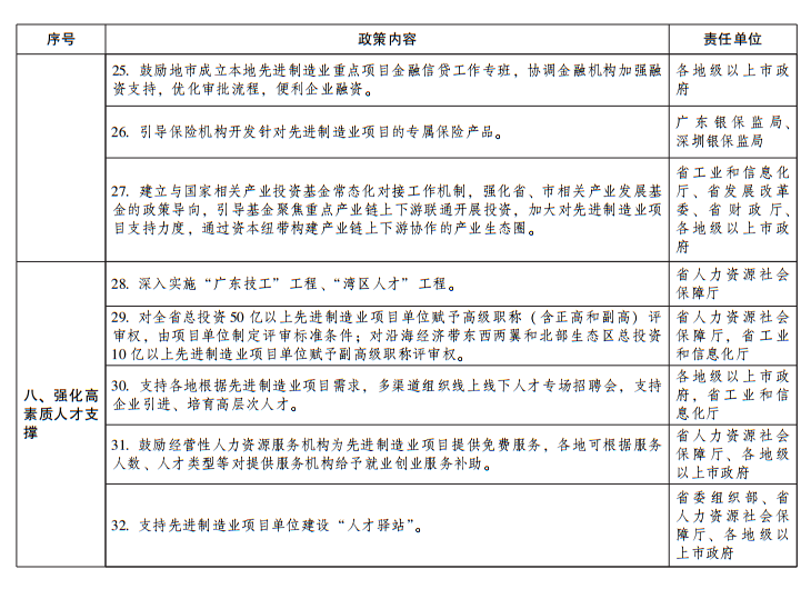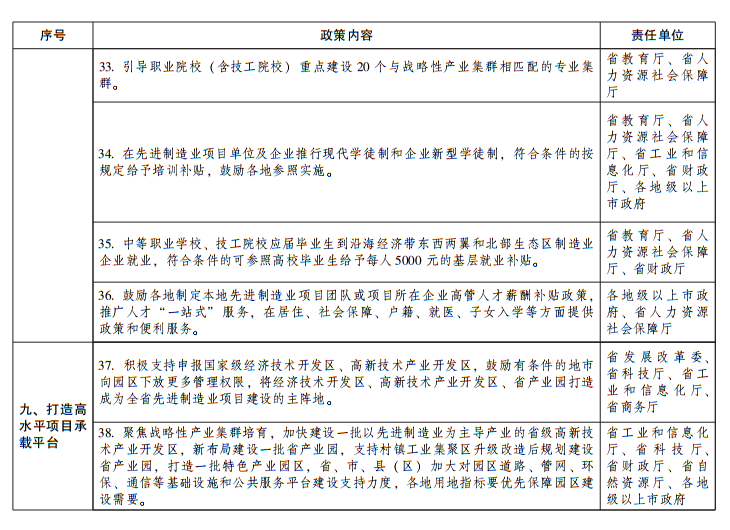 深入实施“广东技工”工程、“湾区人才”工程。对全省总投资50亿以上先进制造业项目单位赋予高级职称(含正高和副高)评审权,由项目单位制定评审标准条件;对沿海经济带东西两翼和北部生态区总投资10亿以上先进制造业项目单位赋予副高级职称评审权。支持各地根据先进制造业项目需求,多渠道组织线上线下人才专场招聘会,支持企业引进、培育高层次人才。鼓励经营性人力资源服务机构为先进制造业项目提供免费服务,各地可根据服务人数、人才类型等对提供服务机构给予就业创业服务补助。支持先进制造业项目单位建设“人才驿站”。引导职业院校(含技工院校)重点建设20个与战略性产业集群相匹配的专业集群。在先进制造业项目单位及企业推行现代学徒制和企业新型学徒制,符合条件的按规定给予培训补贴,鼓励地市参照实施。中等职业学校、技工院校应届毕业生到沿海经济带东西两翼和北部生态区制造业企业就业,符合条件的可参照高校毕业生给予每人5000元的基层就业补贴。鼓励各地制定本地先进制造业项目团队或项目所在企业高管人才薪酬补贴政策,推广人才“一站式”服务,在居住、社会保障、户籍、就医、子女入学等方面提供政策和便利服务。