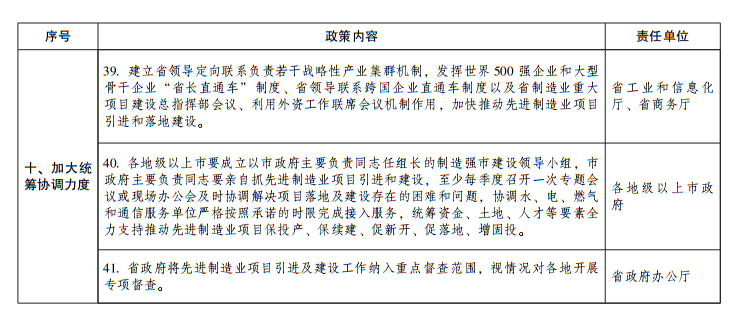 建立省领导定向联系负责若干战略性产业集群机制,发挥世界500强企业和大型骨干企业“省长直通车”制度、省领导联系跨国企业直通车制度以及省制造业重大项目建设总指挥部会议、利用外资工作联席会议机制作用,加快推动先进制造业项目引进和落地建设。各地级以上市要成立以市政府主要负责同志任组长的制造强市建设领导小组,市政府主要负责同志要亲自抓先进制造业项目引进和建设,至少每季度召开一次专题会议或现场办公会及时协调解决项目落地及建设存在的困难和问题,协调水、电、燃气和通信服务单位严格按照承诺的时限完成接入服务,统筹资金、土地、人才等要素全力支持推动先进制造业项目保投产、保续建、促新开、促落地、增固投。省政府将先进制造业项目引进及建设工作纳入重点督查范围,视情况对各地开展专项督查。