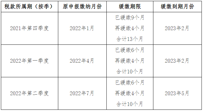 所属期是2022年2月、3月(包括按季缴纳的2022年第一季度税费)、4月、5月、6月(包括2022年第二季度税费)的缓缴税费在延长6个月的基础上继续延长4个月(合计延长10个月),分别在2023年1月至2023年5月入库。具体缓缴期限见下表: