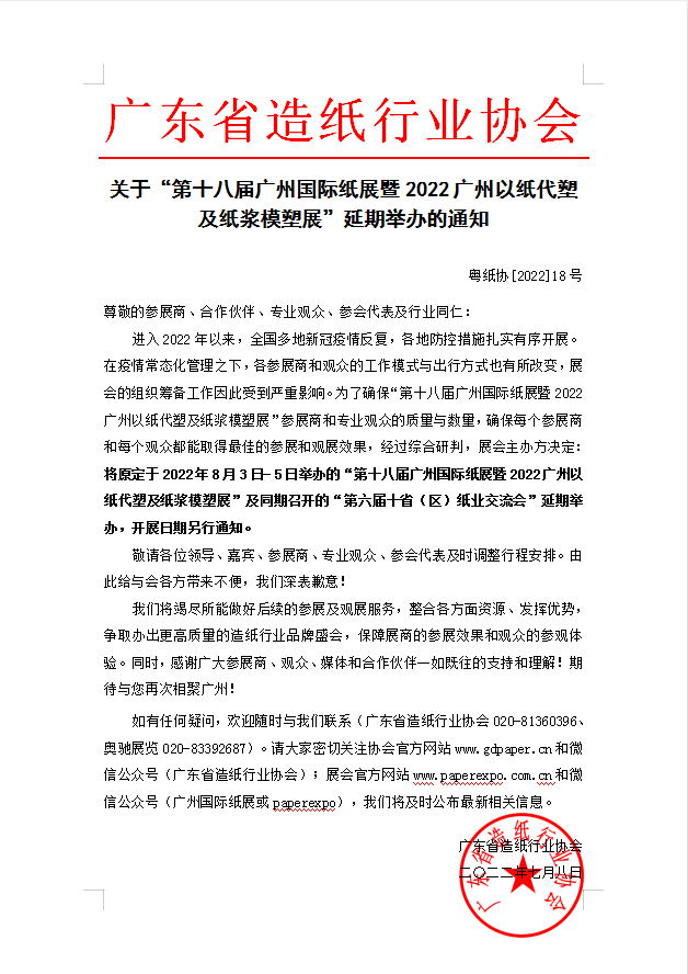 进入2022年以来,全国多地新冠疫情反复,各地防控措施扎实有序开展,在疫情常态化管理之下,各参展商和观众的工作模式与出行方式也有所改变,展会的组织筹备工作因此受到严重影响,为了确保“第十八届广州国际纸展暨2022广州以纸代塑及纸浆模塑展”参展商和专业观众的质量与数量,确保每个参展商和每个观众都能取得最佳的参展和观展效果 鼎盛平台,经过综合研判,展会主办方决定:将原定于2022年8月3日- 5日举办的“第十八届广州国际纸展暨2022广州以纸代塑及纸浆模塑展”及同期召开的“第六届十省(区)纸业交流会”延期举办,开展日期另行通知。