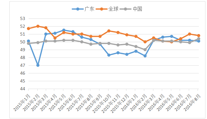 从全球和中国的制造业PMI指数可以看出,2015年至今,全球PMI基本都在荣枯线之上,全国PMI指数则在荣枯线附近徘徊,低于全球,而广东省PMI指数2015年波动大,上半年在50%线上,下半年则在50%线下,2016年广东省PMI指数则相对平稳,呈现出稳中微进,稳中求优的态势, 鼎盛平台app。