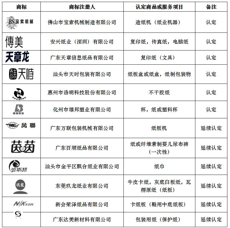 表3 2015年被评为广东省著名商标的造纸企业