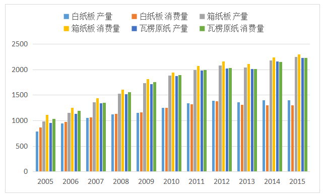 据了解,全球瓦楞纸箱的需求量以每年3.4%的增长速度上升,其中,有很大一部分增长来自中国,增速约7%,新兴市场包括巴西、智利、阿根廷等国家和地区,年增长约3%,中国在全球瓦楞包装市场中占据主导地位。2015年,全国包装纸的产销量仍保持小幅增长,逐渐趋于稳定,瓦楞原纸的产销基本平衡,白纸板由于之前集中产能扩张,目前产量仍超过消费量,但经过这几年的调整,已逐步恢复。箱纸板的产能还不能完全满足消费需求,还有约3-4%的箱纸板需要进口。由于近几年广东省包装纸新增产能较少,且在逐年淘汰落后产能,预计行业景气度将逐步改善,开工率将有所上升。