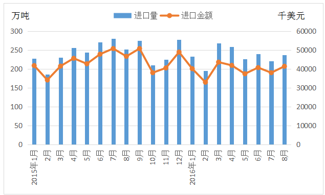 2015年我国进口废纸2928万吨,同比增长6.4%;废纸进口金额52.8亿美元,同比下降1.2%。2016年1-8月累计进口1878万吨,同比下降3.35%;进口金额31.55亿美元,同比下降9.98%,可见废纸进口量增长,但进口总金额下跌,进口均价下降。随着国内废纸回收体系的不断健全以及废纸的质量提高,国内废纸回收率逐步提高,对进口废纸的依赖度逐渐下降。
