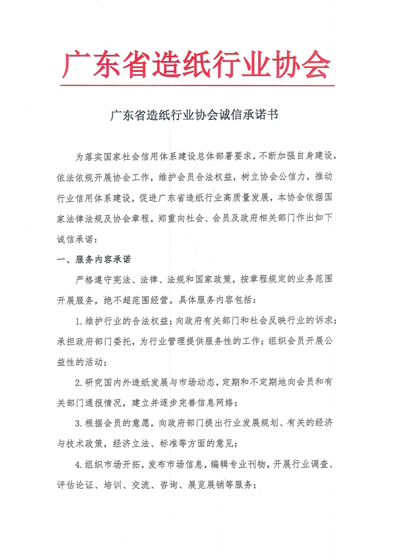 为落实国家社会信用体系建设总体部署要求,不断加强自身建设,依法依规开展协会工作,维护会员合法权益 鼎盛平台,树立协会公信力,推动行业信用体系建设,促进广东省造纸行业高质量发展,本协会依据国家法律法规及协会章程,制定以下诚信承诺书。