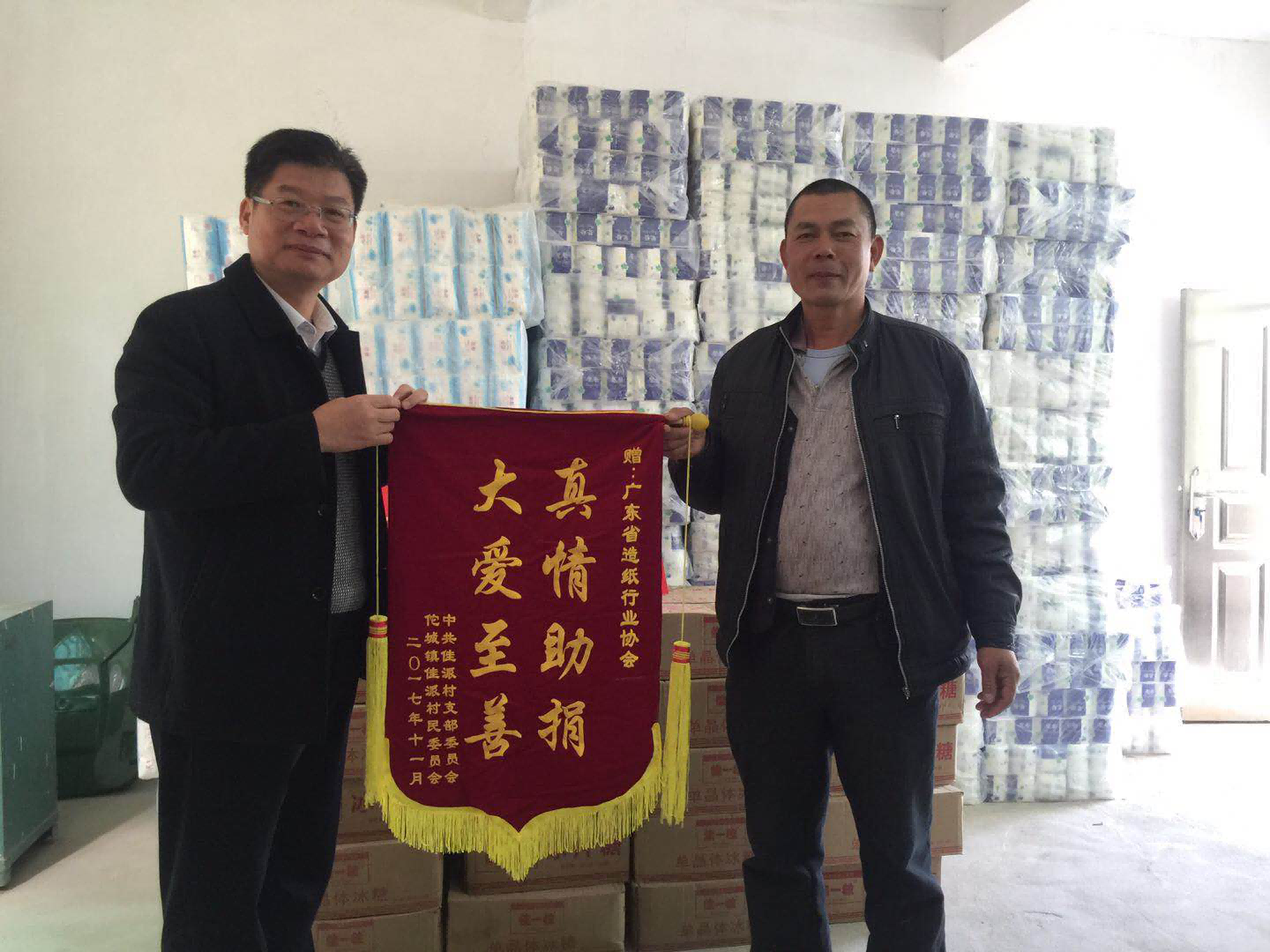 2017年12月22日,在广东省经济和信息化委员会消费品工业处万淑萍处长的带领下,鼎盛平台会长翁卓与技术服务部谢明前往河源市龙川县佗城镇佳派村开展扶贫慰问公益活动,为广东省重点扶贫点之一佳派村村委捐赠了一批生活用纸及糖类制品,并送上节日慰问。