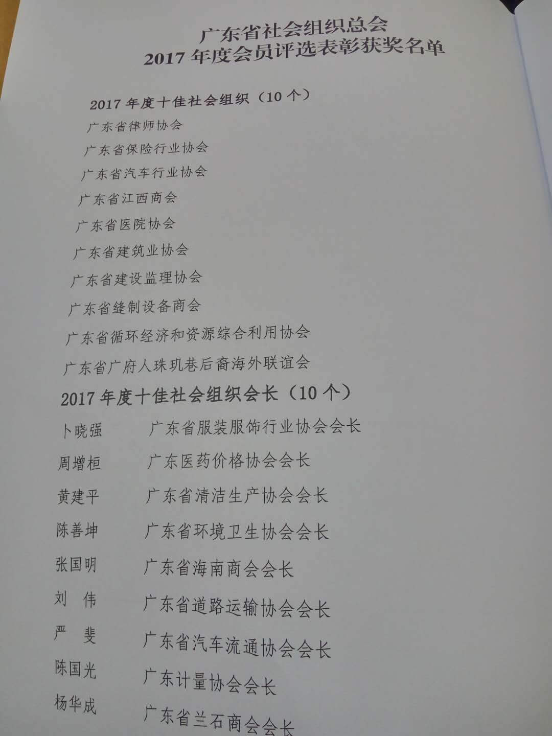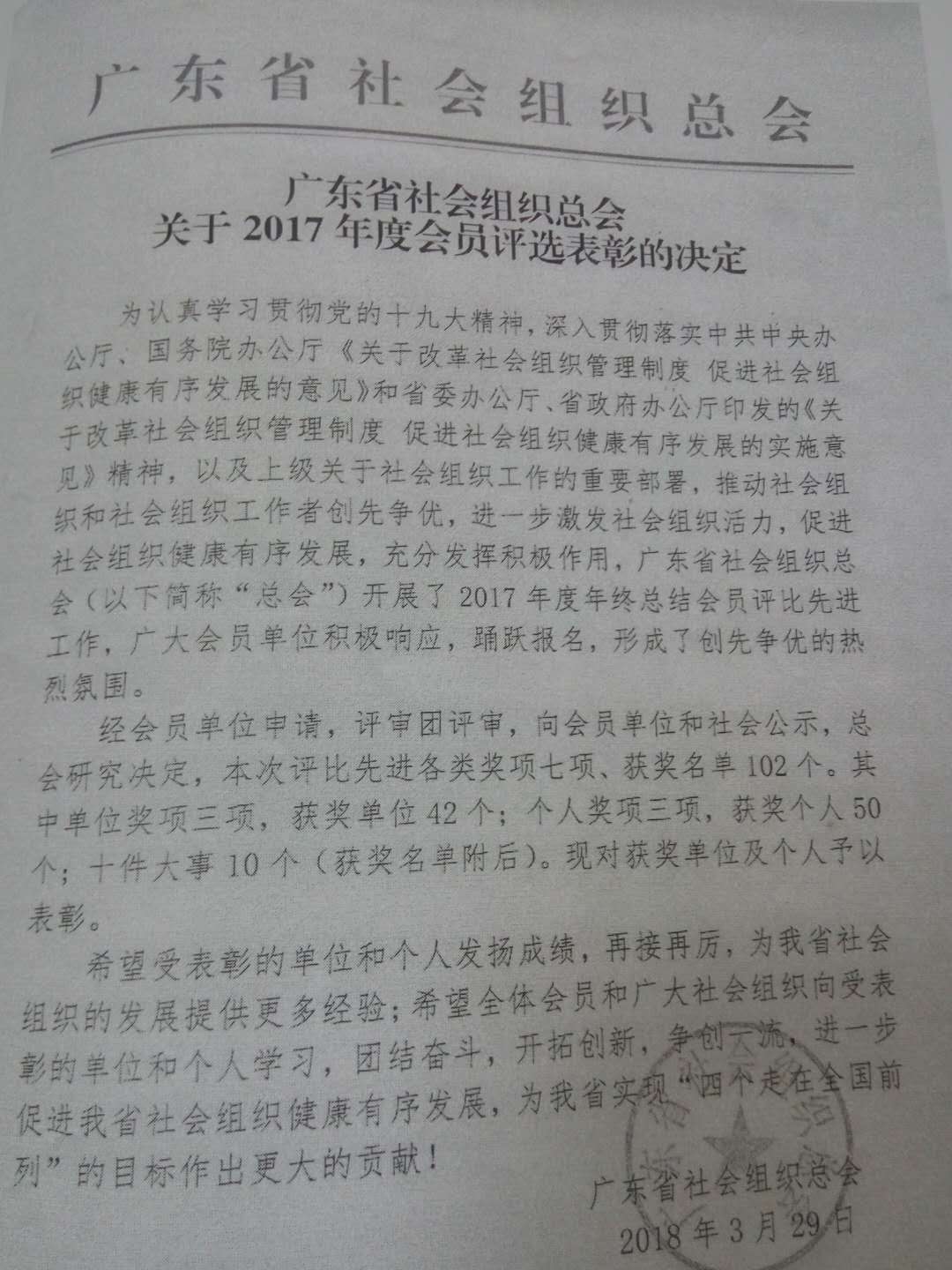 会上宣读了《广东省社会组织总会关于2017年度会员评选表彰