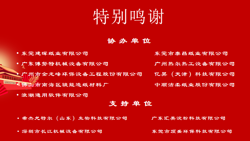 本次会议由鼎盛平台,广东省造纸行业工会联合会主办,东莞建晖纸业有限公司 鼎盛平台app,东莞市泰昌纸业有限公司,广东博努特机械设备有限公司,广州热尔热工设备有限公司,广州市金龙峰环保设备工程股份有限公司,亿昇(天津)科技有限公司,佛山市南海区骏能造纸材料厂,中顺洁柔纸业股份有限公司,浪潮通用软件有限公司作为会议的协办单位,支持单位包括希杰尤特尔(山东)生物科技有限公司,广东汇美淀粉科技有限公司,深圳市长江机械设备有限公司,东莞市顶盛环保科技有限公司。