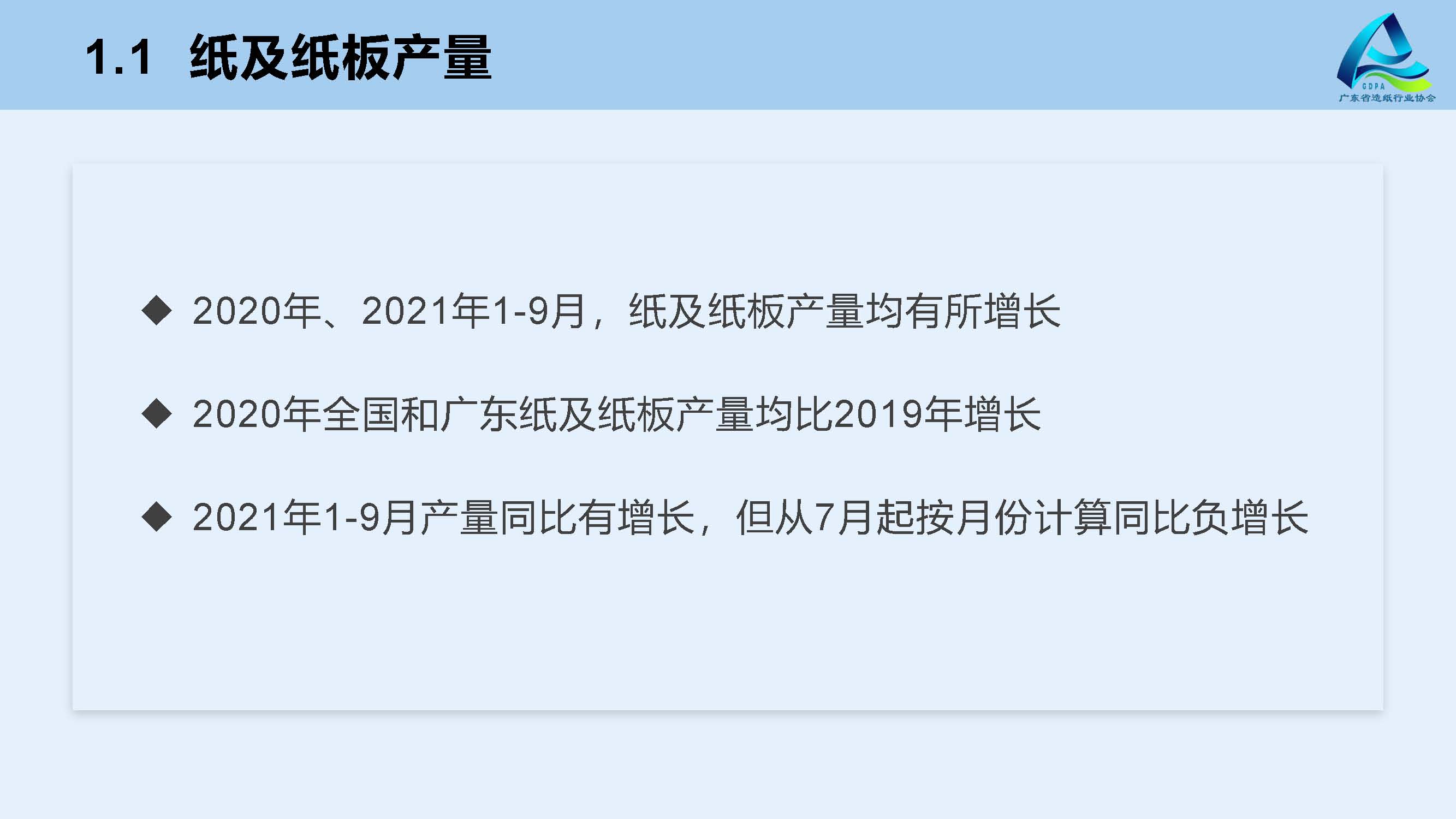 首先,陈竹常务副会长从多方面对广东省造纸行业概况进行了分析。2020年广东省纸及纸板产量2435,96万吨,同比增长9,6%,占全国纸及纸板产量的21,6%。2021年1-9月,广东省纸及纸板产量1832 鼎盛官网,99万吨,同比增加6,1%;广东省纸及纸制品业工业增加值为426亿元,同比上升8,9%。2021年7月后,广东省纸及纸制品业产量和工业增加值月度数据与去年同期相比均有所下降,虽然累计值与去年同比上升,但增速也在逐月降低,呈现明显降速趋势。。
