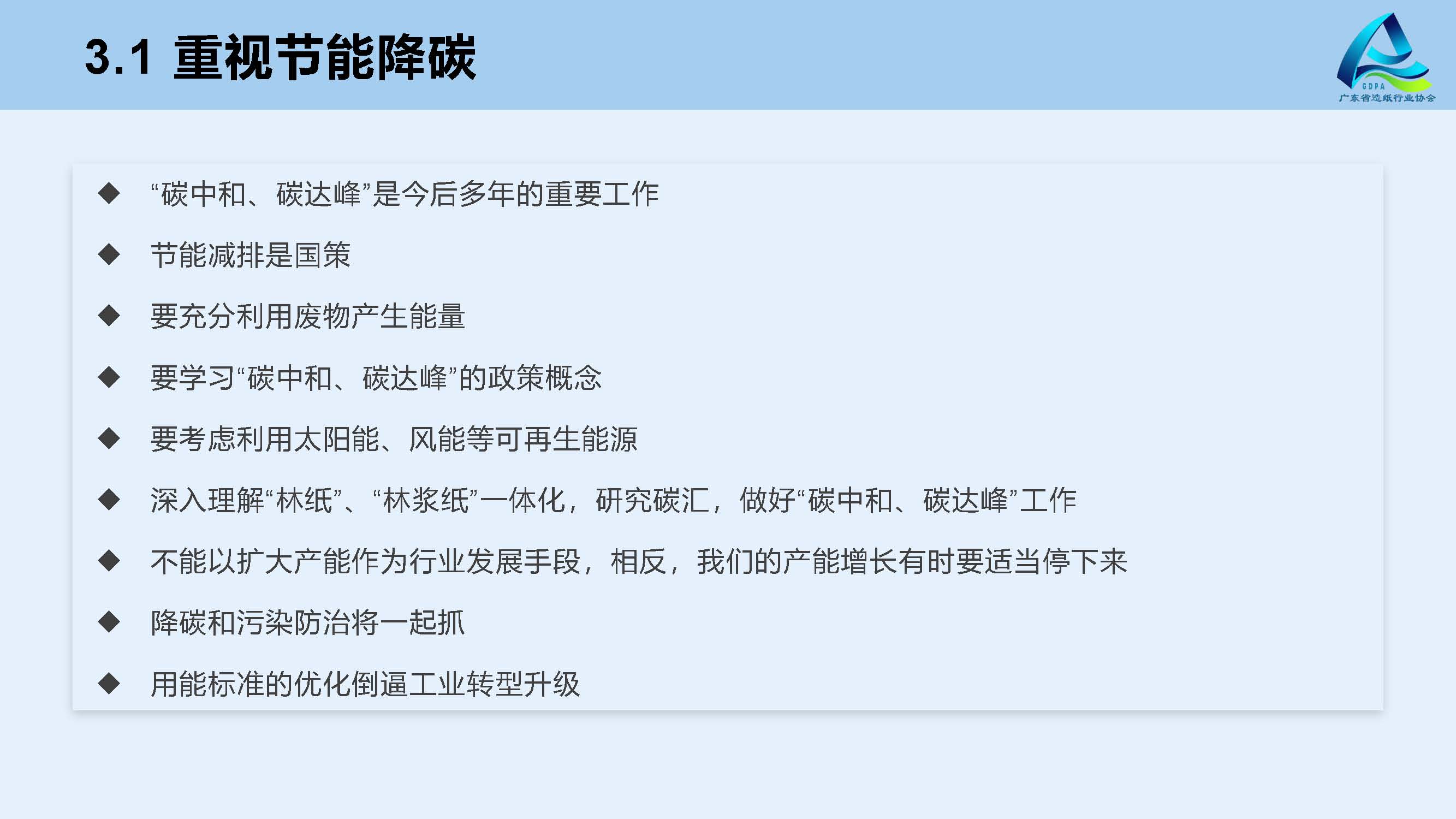 最后,陈会长根据今年的行业热点政策以及企业在生产经营过程中存在的一些困难,提出了造纸企业应该注意以下几点: 鼎盛网页版.