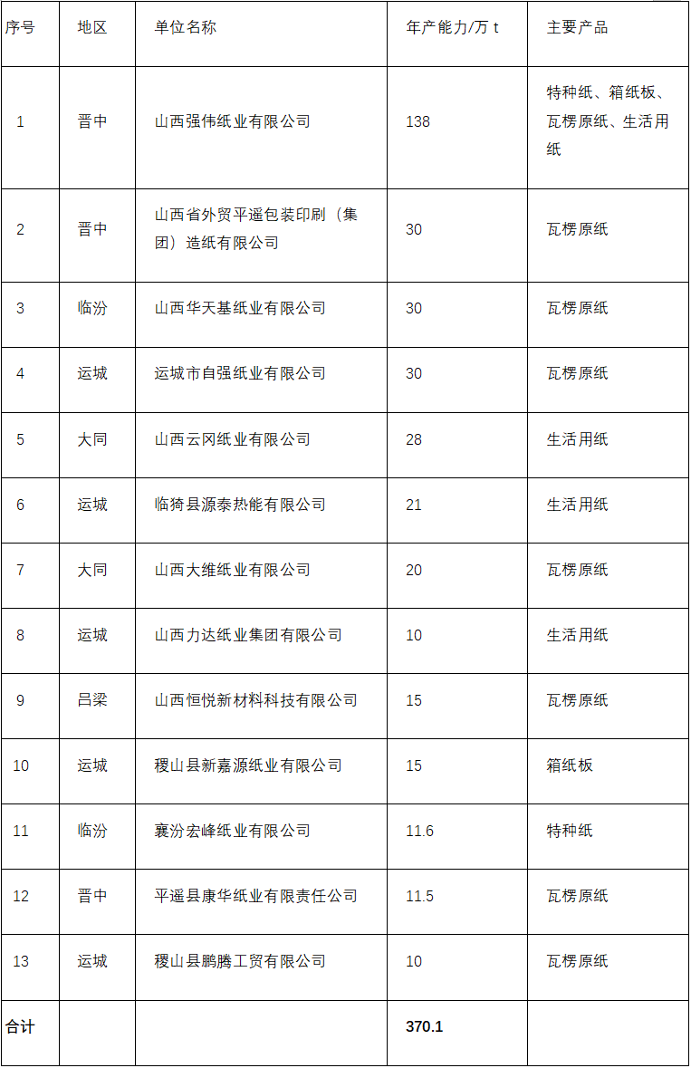 按造纸生产能力分类,山西省有1家大型(年产100万t以上)企业,中型(年产30万~100万t)的企业3家,年产10万~30万t的小型企业9家,以上13家造纸企业合计产能370,1万t 鼎盛在线,占山西省机制纸及纸板总产能的88,9%,详见表1, 鼎盛入口。